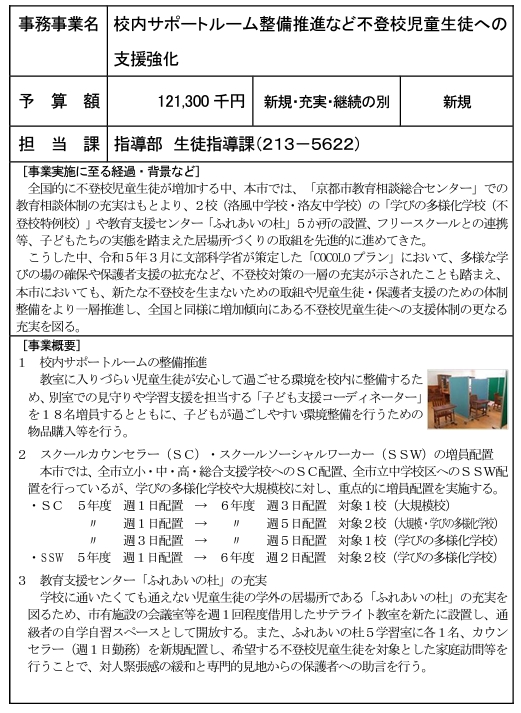 R6年度予算では、教育委員会の予算編成方針の重点項目の1つに不登校支援が記載され、新たに予算もつきました。
